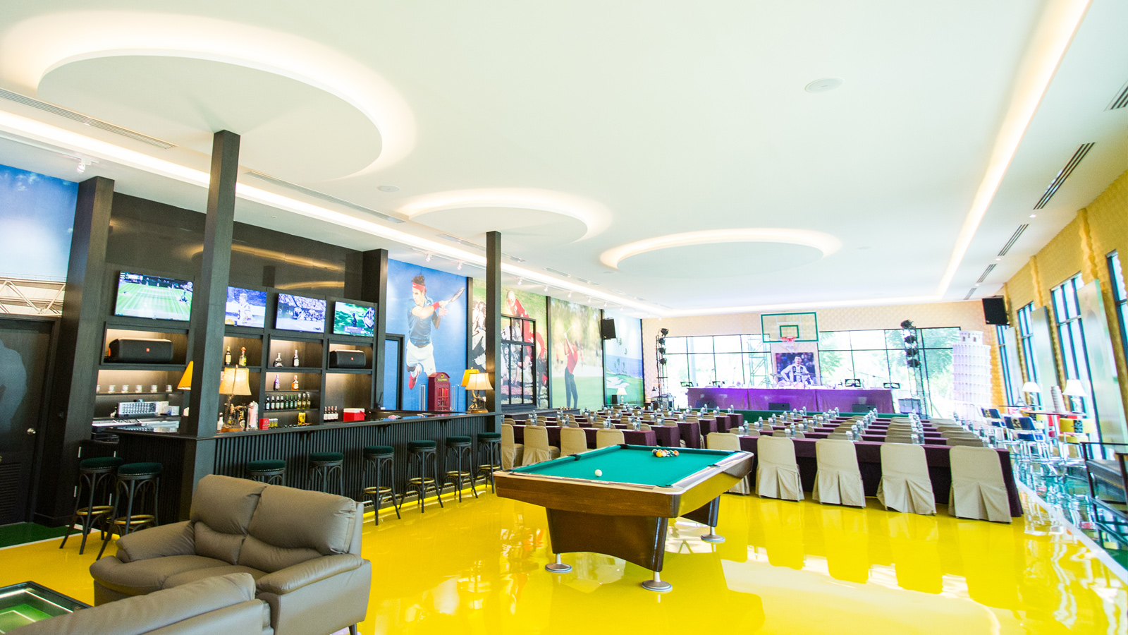 สปอร์ต บาร์ (Sports Bar) ห้องจัดเลี้ยงและกิจกรรมสันทนาการ ตกแต่งในบรรยากาศธีมสปอร์ต เหมาะกับการจัดงานเลี้ยงสังสรรค์ในรูปแบบต่างๆ การประชุมสัมมนา กิจกรรม Team Building สำหรับองค์กร สามารถรับรองแขกได้มากถึง 200 คน